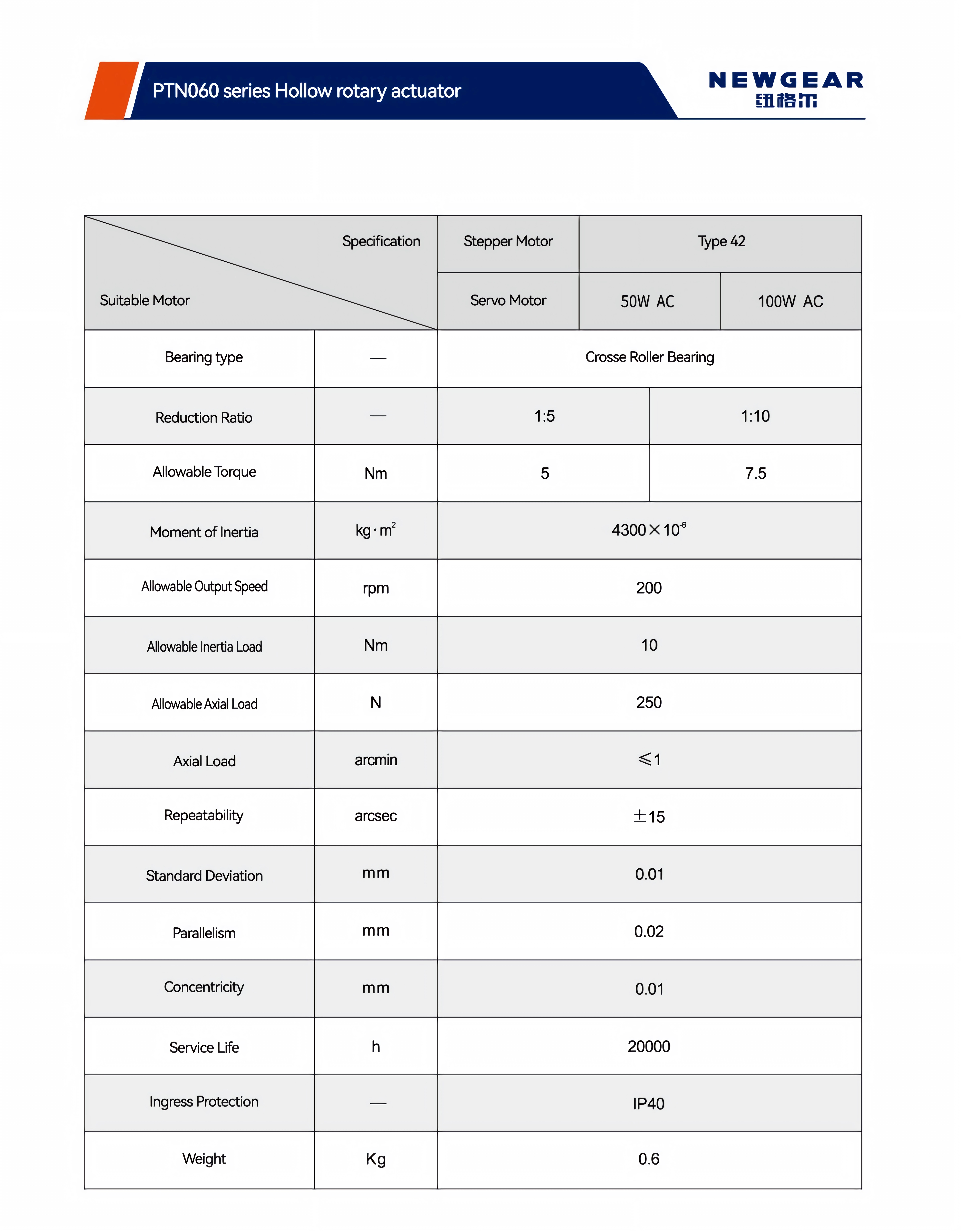 Der PTN060 ist ein kostengünstiges Modell unserer Hohlrundtisch-Serie, das für Automatisierungsanwendungen mit mittlerem bis niedrigem Drehmoment entwickelt wurde. Er ist kompatibel mit NEMA 17-Schrittmotoren und 50-W-/100-W-AC-Servomotoren und bietet Übersetzungsverhältnisse von 5:1 oder 10:1. Mit einem Umkehrspiel von ≤1 Bogenminute und einer Wiederholgenauigkeit von ±15 Bogensekunden gewährleistet er präzises Indexieren und Positionieren. Er übernimmt die Kernvorteile der Plattform und verfügt über eine Durchgangsbohrungskonstruktion sowie hochsteife Kreuzrollenlager für einfache Verkabelung und robuste Leistung. Mit der standardmäßigen Schutzart IP40 eignet er sich für gängige Industrieumgebungen. Darüber hinaus lässt er sich nahtlos mit unseren PX42-Planetengetrieben kombinieren, um die verfügbaren Drehzahl- und Drehmomentbereiche zu erweitern und so eine kompakte und effiziente Drehlösung für Ihre Anlagen zu erhalten.